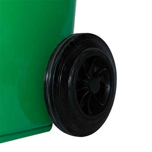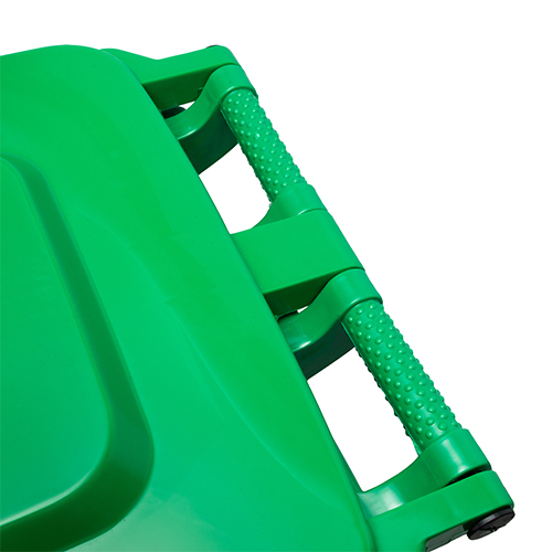 Wyposażony w szczelną pokrywę, skutecznie zabezpiecza zawartość przed deszczem, wiatrem i owadami. Dwa wytrzymałe koła z gumową bieżnią oraz ergonomiczny uchwyt pozwalają na łatwe przemieszczanie pojemnika, nawet w pełni wypełnionego cięższymi odpadami szklanymi.