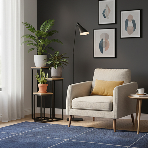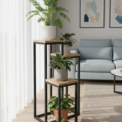 Konstrukcja kwietnika opiera się na stabilnym, geometrycznym stelażu wykonanym ze stali malowanej proszkowo. Cienkie, ale solidne profile (1,5 x 0,9 cm) w eleganckim, matowym wykończeniu nadają mu lekkości, jednocześnie gwarantując trwałość. Czerń metalu tworzy wyrafinowany kontrast z półką wykonaną z wysokiej jakości płyty MDF (17x17x1,5 cm). Drewnopodobna tekstura blatu wprowadza do surowej, industrialnej formy ciepło i przytulność, stanowiąc idealne tło dla zieleni.